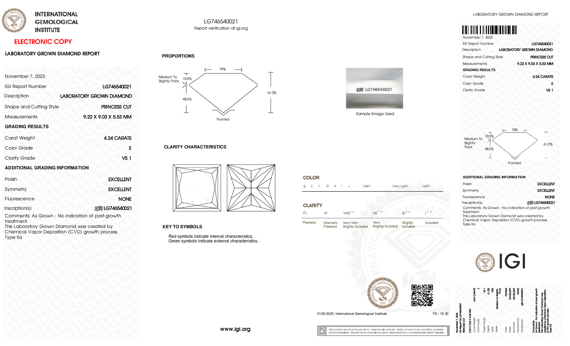 4.24ct Princess Lab Grown Diamond (E, VS1, EX/EX)